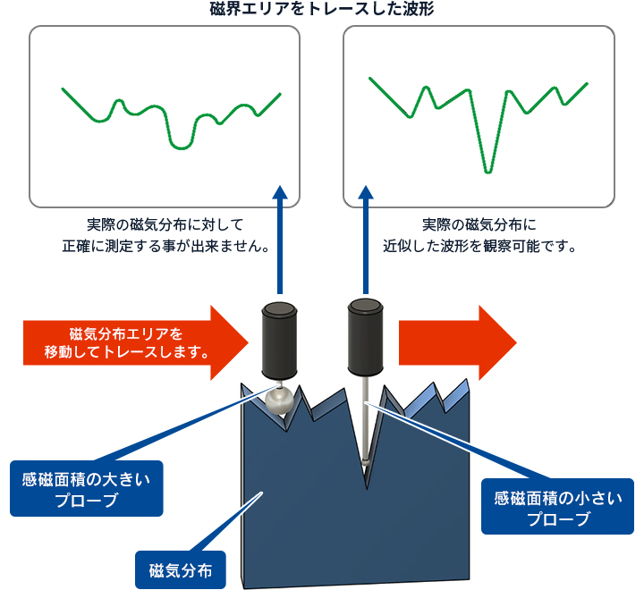 微小磁界を高精度に測定するためには、ホール素子プローブの感磁部と測定対象との距離を極力小さくすること(理想的にはゼロ)が重要です。