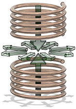 原理といたしましてはコイルを同軸上に2個配置して製品設置位置を中心として反発磁界を発生させます。