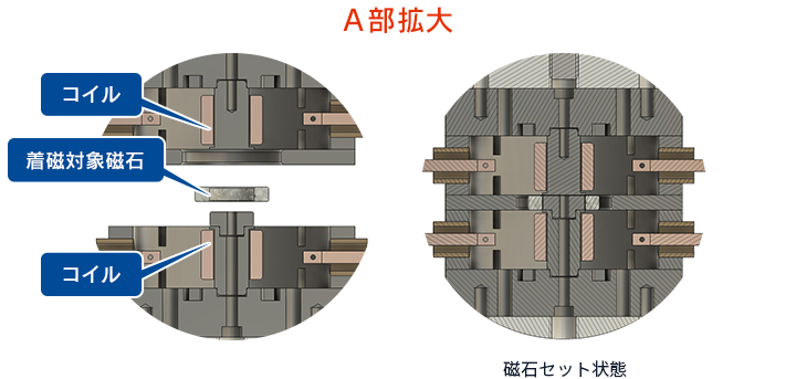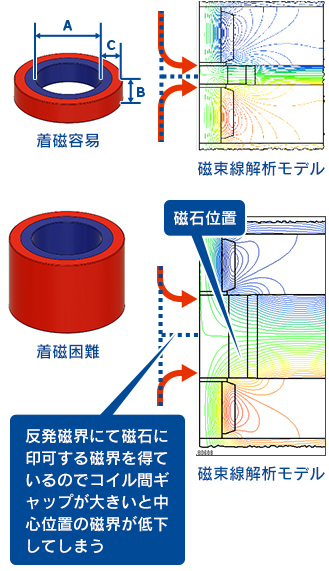 コイルの反発磁界を利用して着磁を行うのでコイル間ギャップが大きいと上下端部で磁束が”曲がって”しまい、中心部に有効な磁束を発生させる事が出来ません。