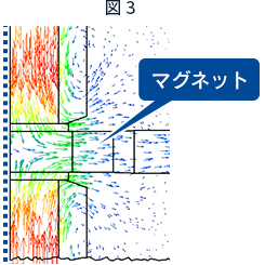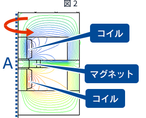図2、図3は指示軸Aを中心とした回転体と設定してマグネットに印可される磁界を解析したデータになります。上下のコイルに中心に向かって反発磁界を発生させ、マグネットを着磁する為の有効な磁界をラジアル方向に得ています。