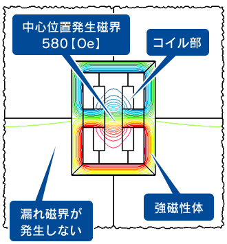 強磁性体による磁気回路を構成する電磁石はヘルムホルツコイルと比較すると本解析上では約5倍の磁力を発生させる事が可能になります。